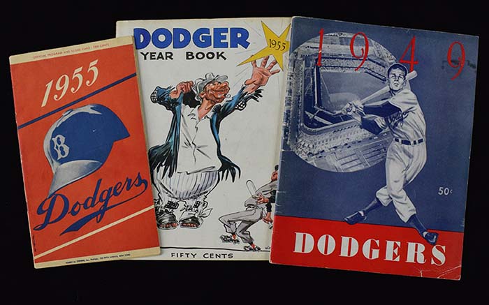 Description:1949 & 1955 Brooklyn Dodgers yearbooks, plus 1955 Dodgers program (GD-EX). Incl. 1949 Dodgers yearbook (EX); 1955 Dodgers yearbook (GD due to detached cover); and July 17th 1955 Cincinnati Reds at Dodgers program (VG/EX, Pee Wee Reese, Duke Snider, Gil Hodges, and Carl Furillo all hit HRs). Range: GD-EX
