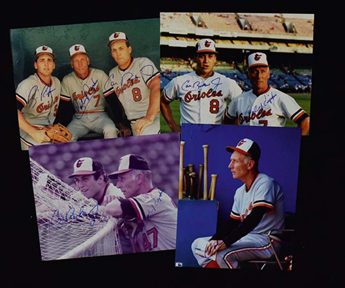 Description:Lot of Ripken family signed 8"x10" photographs (NM-NM/MT). Incl. one photo multi-signed by Cal Ripken Sr, Cal Ripken Jr, and Bill Ripken; (2) different photos dual-signed by Cal Ripken Jr and Cal Ripken Sr (Ripken Jr is smudged on one photo); One photo signed by Cal Ripken Sr; and (5) different photos signed by Billy Ripken. Signatures rate 6 (smudged Ripken Jr) to 10 (avg 8/9) out of 10: NM-NM/MT