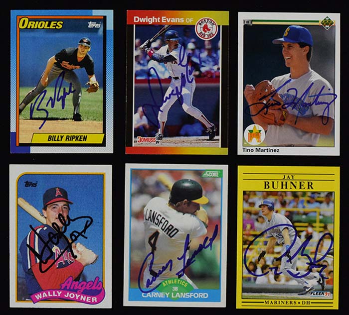 Description:Lot of (206) signed baseball cards (NM overall). Incl. Dwight Evans, Brian Downing, Rick Aguilera, Melido Perez, Ruben Sierra, Mike Greenwell, Wally Joyner, Lance Parrish, Chuck Finley, Tony Pena, Tino Martinez, Mickey Tettleton, Brady Anderson, Harold Reynolds, Steve Finley, Dante Bichette, Omar Vizquel, Jay Buhner, Felix Jose, Greg Walker, Dave Henderson, Jack Clark, Gregg Olson, Carney Lansford, Terry Steinbach, Ben McDonald, Alvin Davis, Jose Mesa, Jeff Ballard, Chris Hoiles, Dickie Thon, Billy Ripken, Donnie Hill, Randy Milligan, Kevin Hickey, Bob Milacki, Craig Worthington, Gary Varsho, Greg Briley, Dave Schmidt, Stan Javier, Darnell Coles, Mike Devereaux, Ron Hassey, Marvell Wynne, Dave West, Jay Tibbs, Bob Melvin, Bill Long, Gene Nelson, Carlos Quintana, Dennis Lamp, Terry Taylor, Tracy Woodson, Mike Campbell, Scott Leius, Dave Veres, Joe Price, Sherman Corbett, Rick Schu, Matt Young, Pete O'Brien, Lance Blankenship, Dave Otto, Jay Aldrich, Matt Sinatro, and others, with multiples of many names mentioned. Signatures rate 4 to 10 (avg 8/9) out of 10: NM overall