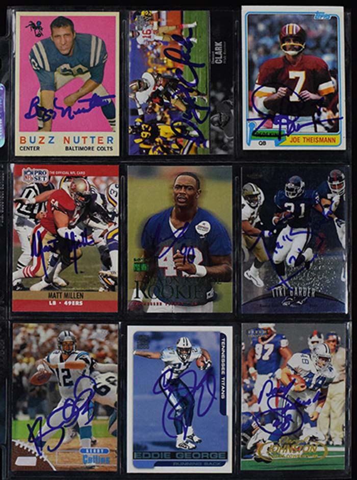 Description:Lot of (589) signed football cards (NM overall). Incl. Buzz Nutter, Johnny Sample, Tiki Barber, Dwight Clark, Ron Jaworski, Eddie George, Joe Thiesmann, Ken Anderson, Vinny Testaverde, Milt Davis, Beasley Reece, Kerry Collins, Webster Slaughter, Matt Millen, Jevon Kearse, L.G. Dupre, Brent Jones, Tim Krumrie, Derrick Alexander, Daryl Johnston, Derrick Mason, Jumbo Elliott, Duane Starks, Jason Sehorn, Wayne Chrebet, Bennie Thompson, Tony Siragusa, Steve Tasker, Carl Pickens, Kyle Brady, Mike Pitts, Ray Perkins, Mark Schlereth, Frank Wycheck, Eric Zeier, Jerry Gray, William Floyd, Yancey Thigpen, Brandon Stokley, Errict Rhett, John Settle, Travis Taylor, Billy Joe Tolliver, Eddie Kennison, Jessie Armstead, Neil O'Donnell, Rob Johnson, Chris Redman, Al Del Greco, Matt Stover, Sean Landeta, Tom Tupa, and others, with multiples of many names mentioned. Signatures rate 3/4 to 10 (avg 8/9) out of 10. Lot has been screened for authenticity, but doe to quantity and obscurity, it is possible that a few secretarial signatures may have slipped through: NM overall