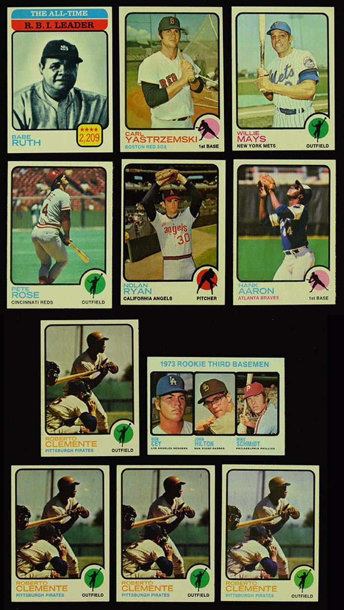 Pack fresh 1973 Topps Baseball complete set of (660) cards with a few extras (Range EX-NM) Keys #50 Clemente (NM-NM/MT), 100 Aaron (NM), 130 Rose (NM), 142 Munson (EX-EX/MT), 174 Gossage (EX/MT-NM), 190 Gibson (NM-MT), 193 Fisk (NM OC), 245 Yaz (NM-MT), 255 Jackson (NM-MT), 305 Mays (NM-MT), 474 Ruth (NM-MT slightly OC), 614 Evans (NM-MT miscut), 615 Schmidt (EX/MT-NM). Also includes an extra Rose (EX-EX/MT), (3) Clemente (EX/MT), and (2) Robinson (EX/MT): Range EX-NM ($400-$600)