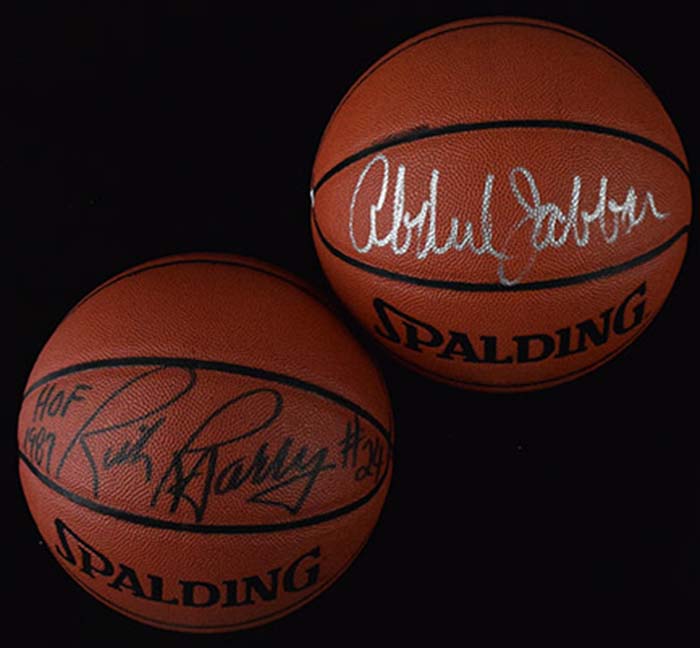 Description:Rick Barry and Kareem Abdul-Jabbar signed basketballs (NM-NM/MT). Incl. Spalding NBA indoor/outdoor basketball signed by Rick Barry with "HOF 1987" inscription; and Spalding NBA indoor/outdoor basketball signed by Kareem Abdul-Jabbar. Signatures rate 8/9 to 9 out of 10: NM-NM/MT