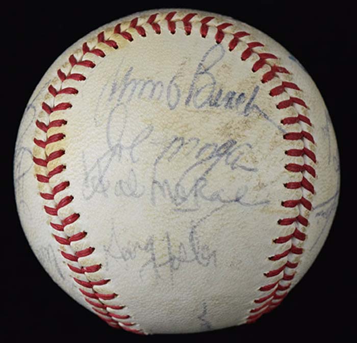 Description:1972 Cincinnati Reds team signed baseball, 16-signatures including starting lineup (EX). C.Feeney NL ball signed by (16) members of the 1972 National League champion Reds including Sparky Anderson, Ted Kluszewski, Johnny Bench, Tony Perez, Joe Morgan, Pete Rose, Dave Concepcion, Denis Menke, Bob Tolan, Cesar Geronimo, Darrel Chaney, Don Gullett, Ted Uhlaender, Hal McRae, George Foster, and Joe Hague. Signatures rate 6 to 8/9 (avg 7) out of 10. Minor toning, with area of surface wear around Bench: EX