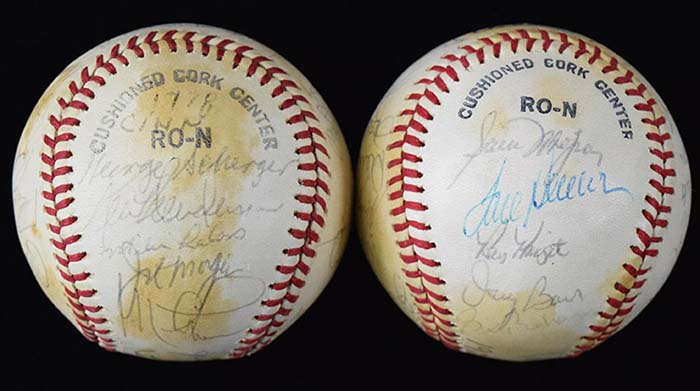 Description:1978 and 1979 Cincinnati Reds team signed baseballs (EX). Incl. C.Feeney NL ball signed by (25) members of the 1978 Reds: Sparky Anderson, Ted Kluszewski, Joe Morgan, Pete Rose, Dan Driessen, Dave Concepcion, George Foster, Cesar Geronimo, Ken Griffey, Tom Hume, Junior Kennedy, Paul Moskau, Mike LaCoss, Pedro Borbon, and others (Bench clubhouse signed); and C.Feeney NL ball signed by (27) members of the 1979 National League West champion Reds: Johnny Bench, Joe Morgan, Tom Seaver, Dan Driessen, Ray Knight, George Foster, Cesar Geronimo, Mike LaCoss, Dave Collins, Fred Norman, Bill Bonham, Tom Hume, and others. Signatures rate 6 to 9 (avg 7) out of 10. Both have areas of moderate toning: EX