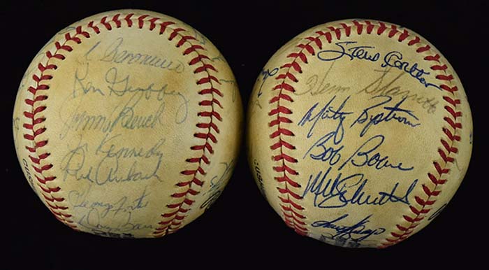 Description:1980 Cincinnati Reds & 1981 Philadelphia Phillies team signed baseballs (EX). Incl. C.Feeney NL ball signed by (28) members of the 1980 Reds: Joe Nixhall (announcer), John McNamara, Johnny Bench, Tom Seaver, Dan Driessen, Junior Kennedy, Dave Concepcion, George Foster, Dave Collins, Ken Griffey, Mike LaCoss, Paul Moskau, Tom Hume, Mario Soto, and others; and C.Feeney NL ball signed by (21) members of the 1981 Phillies: Dallas Green, Mike Schmidt, Steve Carlton, Pete Rose, Tug McGraw, Nino Espinosa, Bob Boone, Manny Trillo, Larry Bowa, Marty Bystrom, Lonnie Smith, Sparky Lyle, and others. Signatures rate 6 to 9/10 (avg 7/8) out of 10. Both have areas of light to moderate toning: EX