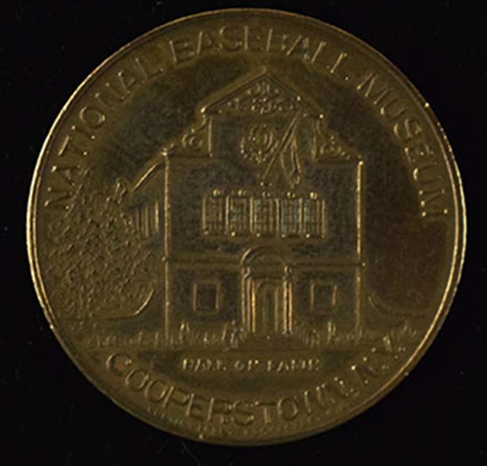 Description:Very rare Baseball Hall Of Fame coin, c.1939 (EX/MT-NM). One side depicts the diamond shaped centennial of baseball logo with text: "Birthplace Of Baseball" "Doubleday Field 1839". The other side depicts a museum exterior image with the text: "National Baseball Museum" "Hall Of Fame" "Cooperstown, NY": EX/MT-NM