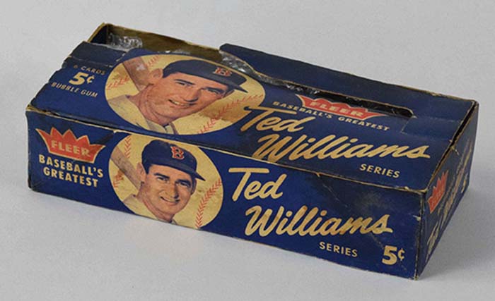 Description:1959 Fleer Ted Williams 5 cent counter display box (see description) Scarce original box in which packs of 1959 Fleer Ted Williams cards would have been housed for retail sale. Displays well with some scattered moisture staining, light toning, and some chipping to color at areas throughout. It appears that the front corners may be reenforced (glued) with a small amount of color added. Small section is missing from the top which has largely separated from balance of the box but positions nicely for display: see description ($400-$600)