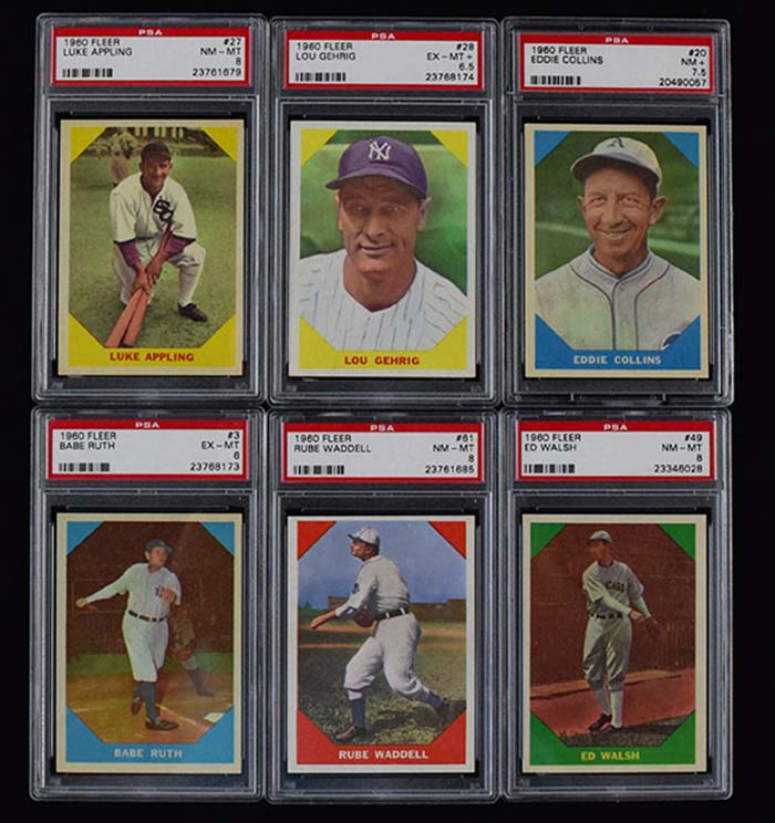 Lot of (15) graded 1960 Fleer "Baseball Greats" (EX/MT-NM/MT). Incl. #s 3 Babe Ruth (PSA 6 EX/MT), 20 Eddie Collins (PSA 7.5 NM+), 27 Luke Appling (PSA 8 NM/MT), 28 Lou Gehrig (PSA 6.5 EX/MT+), 33 Wilbert Robinson (PSA 8 NM/MT), 37 O'Doul (PSA 7.5 NM+), 39 Miller (PSA 8 NM/MT), 43 Derringer (PSA 7 NM), 49 Ed Walsh (PSA 8 NM/MT), 61 Rube Waddell (PSA 8 NM/MT), 70 Newsom (PSA 7 NM), 72 Ted Williams (PSA 6 EX/MT), 73 Warren Giles (PSA 7 NM), 78 Lloyd Waner (PSA 6 EX/MT), and 79 Ralph Kiner (PSA 7.5 NM+). Range: EX/MT-NM/MT