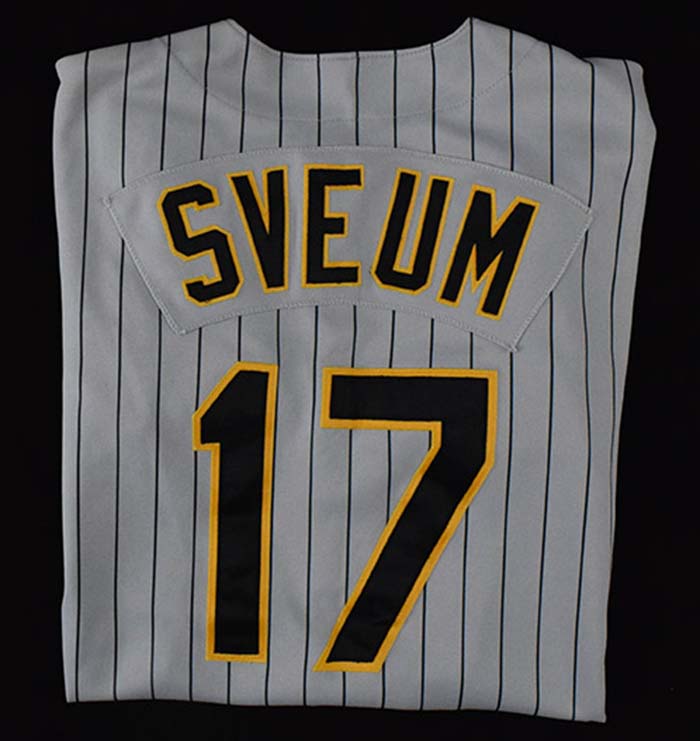 Description:1997 Dale Sveum professional model Pittsburgh Pirates jersey with Jackie Robinson patch (EX/MT). Rawlings size 52 jersey with "Pittsburgh" and number "17" sewn on the front, along with "SVEUM" nameplate and number "17" sewn on the back. Pirates logo patch is sewn on the left sleeve, and Jackie Robinson 50th Anniversary patch is sewn on the right sleeve. Rawlings tagging is sewn inside the front tail, along with "SET 1 1997" and size "52" flag tags. Displays light overall use/wash wear: EX/MT