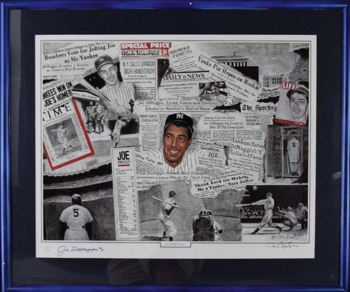 Description:Joe DiMaggio autographed limited edition "Legacy" print (JSA) (NM) Large format display piece has been signed within the lower white border, "Joe DiMaggio #5" in marker rating 8/9 out of 10. Also signed by the artist, Robert Stephen Simon, and hand numbered 100/1,000. Framed for display to 33.5"x40" (touch of light wear to frame) and includes full LOA from JSA: NM-MT ($300-$500)