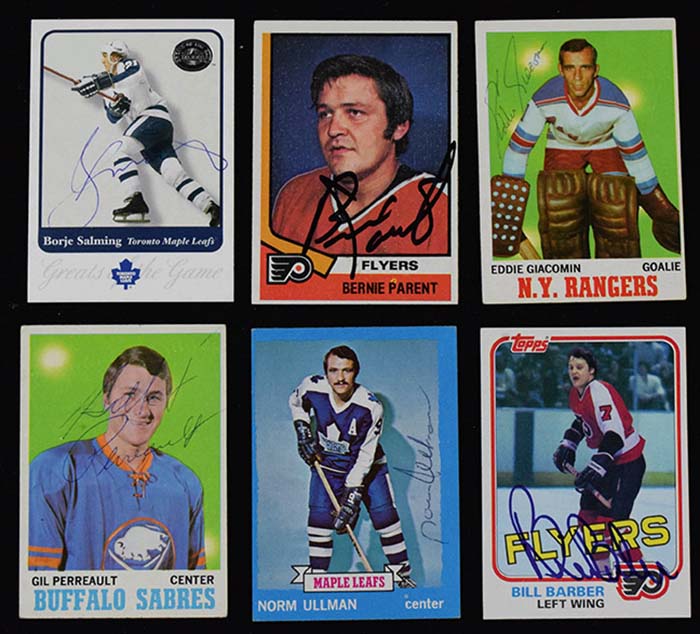 Description:Lot of (49) HOFers signed hockey cards from 1970-2002 (FR/GD-NM/MT). Incl. (3) Bernie Parent, (3) Bill Barber, Denis Potvin, (2) Yvan Cournoyer, (4) Eddie Giacomin, (2) Jacques Lemaire, (2) Brad Park, (3) Gilbert Perreault (one rookie), (4) Norm Ullman, Rod Gilbert, Guy Lafleur, (2) Frank Mahovlich, Dave Keon, Guy Lapointe, (3) Jean Ratelle, (3) Serge Savard, (2) Darryl Sittler, Lanny McDonald (rookie), (2) Marcel Dionne, Stan Mikita, (5) Borje Salming, Mark Howe, and Dale Hawerchuk. Signatures rate 2/3 to 10 (avg 7) out of 10. Most cards appear to average VG/EX-EX overall. Range: FR/GD-NM/MT