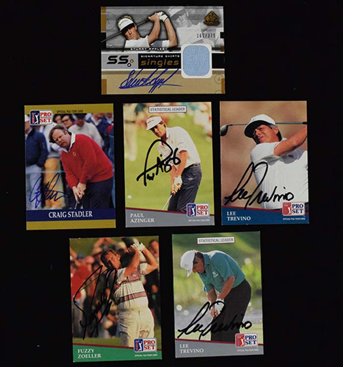 Description:Lot of (380) signed and relic golf cards (EX-NM/MT). Incl. (5) signed insert cards from 2001-2003: (3) Stuart Appleby, Duffy Waldorf, and Charles Howell III; (8) relic insert cards from 2001-2005: Geoff Ogilvy, Lee Janzen, Mark O'Meara, Stephen Ames, Charles Howell III, Ted Purdy, Ian Leggatt, and Brian Davis; and (367) signed golf cards mostly from 1990-1991: (3) Lee Trevino, Nick Faldo, Johnny Miller (smudged), Corey Pavin, Fuzzy Zoeller, Loren Roberts, Scott Verplank, J.C. Snead, Kirk Triplett, Billy Mayfair, Paul Azinger, Craig Stadler, Gary McCord, Gary Koch, Bobby Clampett, Mark McCumber, Bob Tway, Kenny Perry, Jerry Pate, Steve Pate, Larry Nelson, Rocco Mediate, Billy Andrade, Scott Hoch, Jay Haas, and many others, including multiples of most names mentioned. Signatures rate 3/4 to 10 (avg 8) out of 10. Lot has been screened for authenticity, but due to quantity & obscurity, it is possible that secretarial sigs many have slipped through. Most cards appear to average NM overall. Range: EX-NM/MT