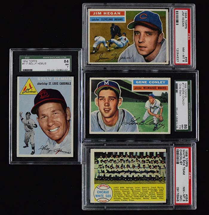 Lot of (28) graded baseball cards from 1954-1958 (VG-NM/MT). Incl. 1954 Bowman #70 Marshall (PSA 4 VG/EX); 1954 Topps #s 117 Hemus (SGC 84 NM), 135 Presko (SGC 84 NM), 186 Olson (SGC 84 NM), and (2) 219 Kress (both SGC 84 NM); 1956 Topps #s 17 Conley gray back (SGC 86 NM+), 48 Hegan white back (PSA 8 NM/MT), 78 Wehmeier white back (SGC 70 EX+), and 278 Nichols gray back (SGC 40 VG); 1958 Topps #s 140 Covington (SGC 70 EX+), 212 Phillips (SGC 80 EX/NM), 217 Harshman (SGC 80 EX/NM), 224 Grim (SGC 70 EX+), 229 Zupo (SGC 80 EX/NM), 232 Bertoia (SGC 60 EX), 234 Sawatski (SGC 60 EX), 235 Gorman (SGC 70 EX+), 256 White Sox team checklist (PSA 8 NM/MT mc), 264 Sanford (SGC 60 EX), 265 Runnels (SGC 80 EX/NM), 266 Johnson (SGC 80 EX/NM), 269 Smith (SGC 84 NM), 367 Urban (SGC 60 EX), 371 Keough (SGC 60 EX), 403 Korcheck (SGC 84 NM), 404 Simmons (SGC 70 EX+), and 459 Blackburn (SGC 84 NM). Range: VG-NM/MT