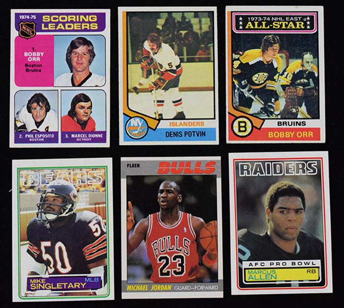 Description:Lot of (5) Basketball, Football, and Hockey card sets and partial sets from 1974-1988 (VG-NM/MT). Incl. 1974-75 Topps Hockey set only missing #s 27, 100, 132, 161, and 184 (avg EX-EX/MT overall with many NM); 1974-75 Topps Hockey set only missing #s 27, 100, 130, 132, 154, 162, 184, and 206 (avg EX-EX/MT overall with many NM); 1975-76 Topps Hockey set only missing #s 22, 81, 91, 98, 100, 178, 197, 198, 232, 247, 256, 261, 267, and 282 (avg EX/MT overall); 1983 Topps Football complete set (avg NM overall); and 1987-88 Fleer Basketball complete set (avg EX/MT-NM overall, Michael Jordan has wax stain on back). Range: VG-NM-MT