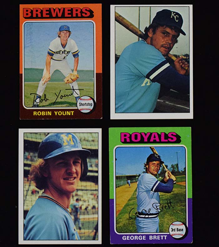 Description:1975 Topps Baseball near complete set & 1975 SSPC complete set (VG-NM/MT). Incl. 1975 SSPC set with #s 167 George Brett rookie (NM oc), and 238 Robin Yount rookie (NM), remainder appear to average EX/MT-NM overall; and 1975 Topps set only missing (23) cards: #s 65, 71, 257, 260, 331, 379, 424, 439, 475, 487, 489, 494, 496, 498, 499, 531, 583, 600, 608, 624, 642, 646, and 656, but includes #s 223 Yount rookie (VG/EX-EX), and 228 Brett rookie (EX), remainder appear to average VG/EX-EX overall. Range: VG-NM/MT