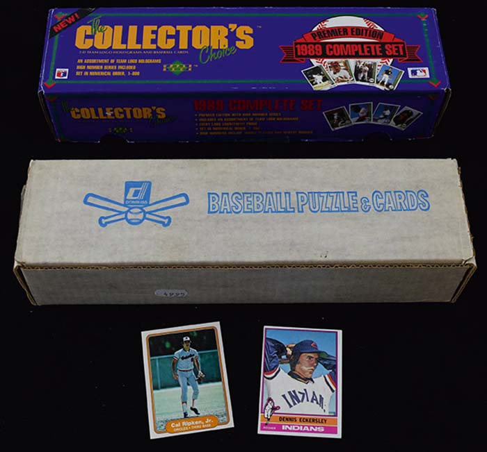Description:Lot of (4) Baseball card sets from 1976-1989 (GD/VG-MT). Incl. 1976 Topps set with #s 19 George Brett (VG oc), 98 Dennis Eckersley rookie (VG/EX-EX oc), 550 Hank Aaron (EX-EX/MT), remainder appear to average VG/EX-EX overall; 1982 Fleer set with #176 Cal Ripken Jr rookie (NM); 1983 Donruss factory set (presumed NM/MT); and 1989 Upper Deck factory set (presumed NM/MT). Range: G/VG-MT