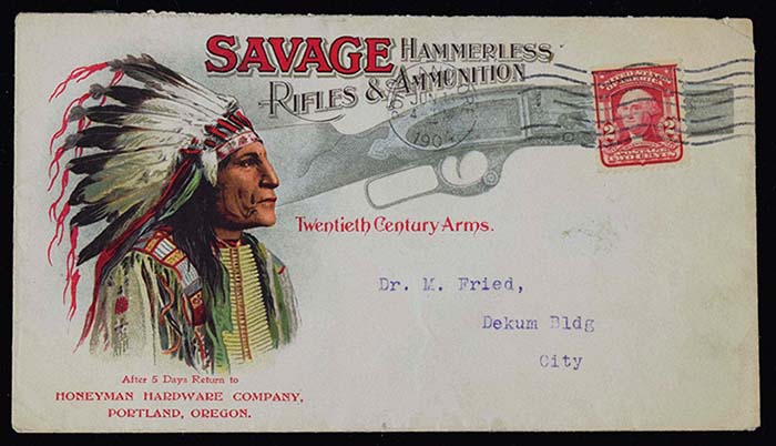 Description:Choice 1904 Savage Arms advertising cover (EX) Beautifully illustrated cover is postally cancelled 1904 and displays a hint of light toning and scattered wear. Opened along upper edge: EX ($400-$600)