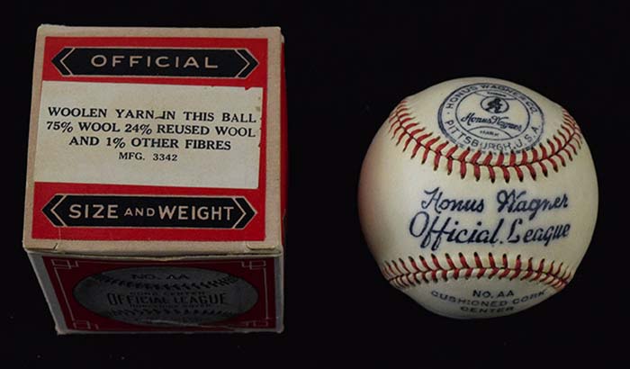 Description:Honus Wagner Co. baseball with original box, c.1930s (ball EX/MT-NM, box VG-VG/EX). Ball features the Honus Wagner Co. stamping, with "Honus Wagner" "Official League" in script across the sweet spot (EX/MT-NM, light toning). Comes with original box with a tear and a missing flap (VG-VG/EX).