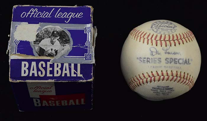 Description:Don Larsen endorsed "Series Special" baseball with original box, c. late 1950s (ball EX/MT-NM, box VG-VG/EX). The baseball features Larsen's facsimile signature above "Series Special" stamping on the sweet spot (EX/MT-NM, very minor toning). Comes with original box which features an image of Larsen on the lid, but there is a tear around his image (VG-VG/EX).