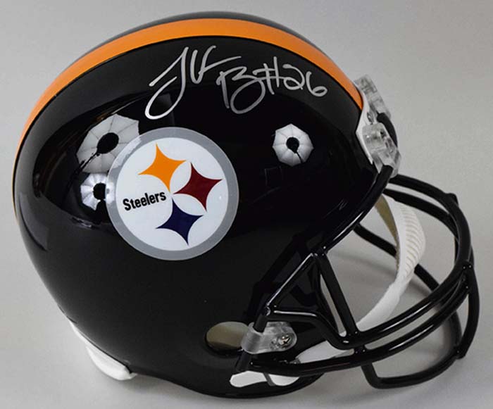 Description:Le'Veon Bell signed Pittsburgh Steelers full size helmet, JSA (NM). Riddell full size Steelers replica helmet signed by Bell in silver marker. Signature rates 9 out of 10. Comes with COA from JSA (serial #ed sticker is affixed): NM
