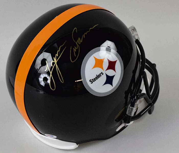 Description:Lynn Swann signed Pittsburgh Steelers full size helmet, PSA/DNA (NM). Riddell full size Steelers replica helmet signed by Swann in gold marker. Signature rates 9 out of 10. Comes with COA from PSA/DNA (serial #ed sticker is affixed): NM