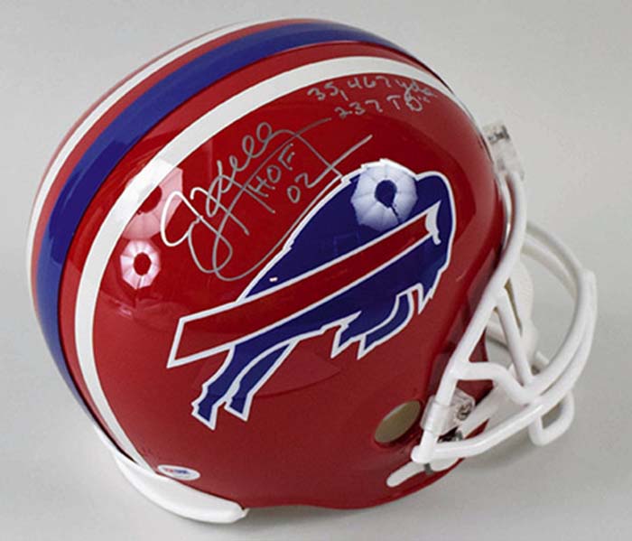 Description:Jim Kelly signed & multi-inscribed Buffalo Bills full size helmet, PSA/DNA (NM). Riddell full size Bills replica helmet signed by Kelly in silver marker with "HOF 02" "35,467 yds" "237 TD's" inscriptions. Signature rates 9 out of 10. Comes with COA from PSA/DNA (serial #ed sticker is affixed): NM