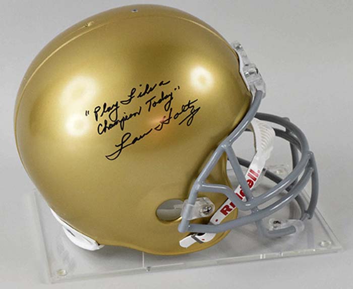 Description:Lou Holtz signed & inscribed Notre Dame Fighting Irish full size helmet, JSA (NM). Riddell full size Notre Dame replica helmet signed by Holtz in black marker with "Play Like a Champion Today" inscription. Signature rates 9 out of 10. Comes with COA from JSA (serial #ed sticker is affixed): NM