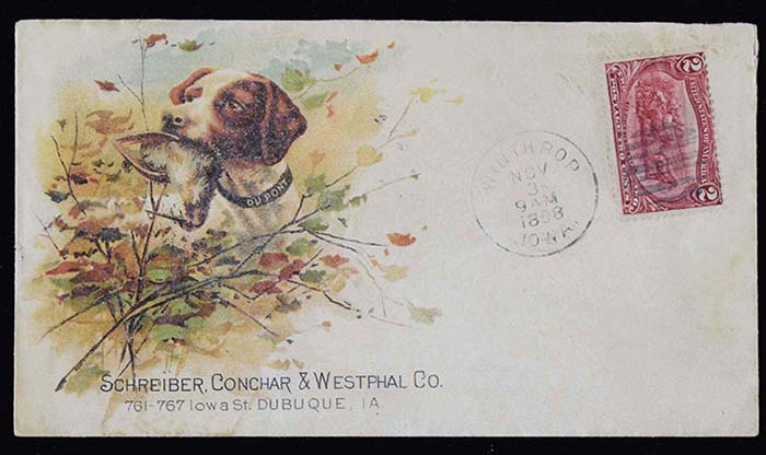 Description:1898 DuPont advertising cover - early example featuring their iconic hunting dog mascot (VG-EX) Postally cancelled with light toning and mild scattered wear. Opened along top edge: VG-EX ($300-$500)