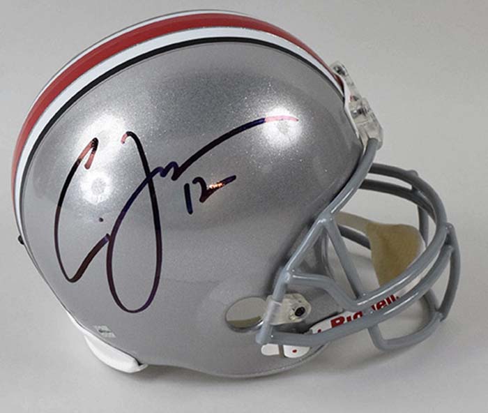 Description:Cardale Jones signed Ohio State Buckeyes full size helmet (NM). Riddell full size Ohio State helmet signed by Jones in black marker. Signature rates 9/10 out of 10. Comes with Sports Integrity COA (hologram sticker is affixed): NM