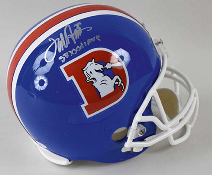 Description:Terrell Davis signed & inscribed Denver Broncos full size helmet, JSA (NM). Riddell full size Broncos replica helmet signed by Davis in silver marker with "SB XXXII MVP" inscription. Signature rates 9 out of 10. Comes with COA from JSA (serial #ed sticker is affixed): NM