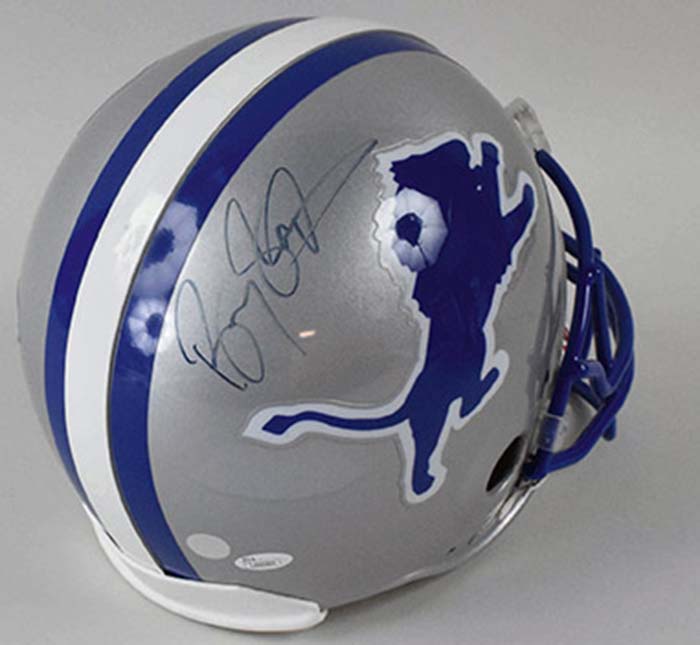 Description:Barry Sanders signed Detroit Lions full size on-field style helmet, JSA (NM). Riddell full size Lions pro quality helmet signed by Sanders in blue marker. Signature rates 7/8 out of 10. Comes with COA from JSA (serial #ed sticker is affixed): NM