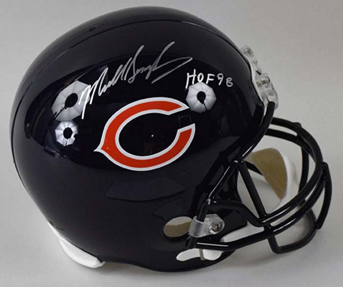 Description:Mike Singletary signed & inscribed Chicago Bears full size helmet, JSA (NM). Riddell full size Bears replica helmet signed by Singletary in silver marker with "HOF 98" inscription. Signature rates 9 out of 10. Comes with COA from JSA (serial #ed sticker is affixed): NM