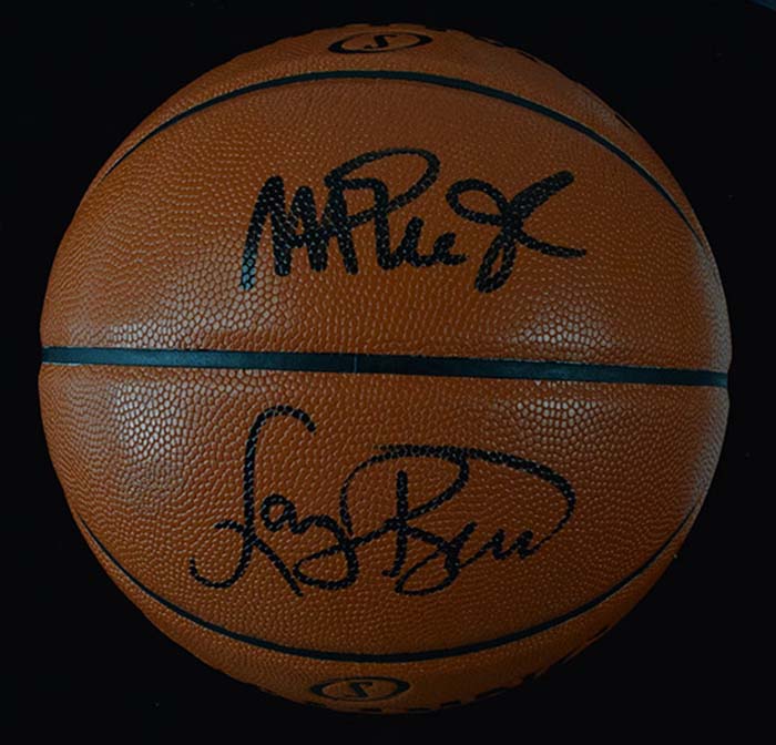 Description:Larry Bird & Magic Johnson dual-signed Spalding NBA basketball, JSA (NM/MT). Spalding NBA indoor/outdoor Game Ball Series basketball signed by both Johnson and Bird in black marker. Signatures rate 9 to 9/10 out of 10. Comes with COA from JSA (serial #ed sticker is affixed): NM/MT