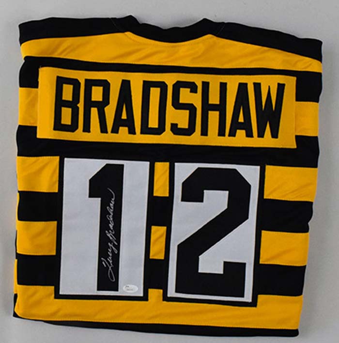 Description:Terry Bradshaw signed Pittsburgh Steelers throwback style jersey, JSA (NM). Size XL #12 Terry Bradshaw jersey signed by Bradshaw in silver marker. Signature rates 9 out of 10. Comes with COA from JSA (serial #ed sticker is affixed). No maker tagging is present: NM