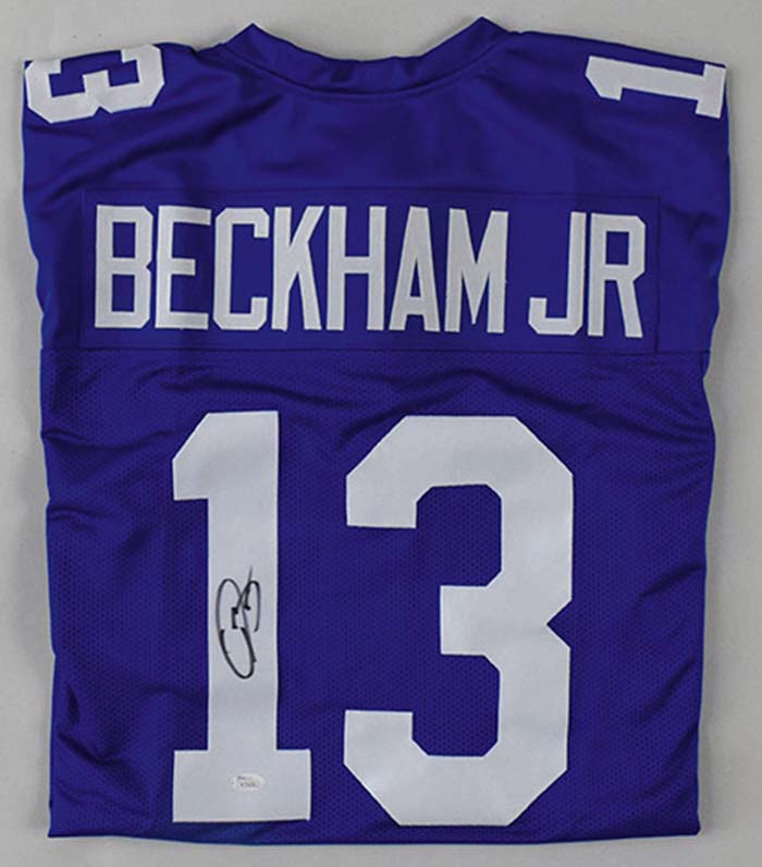 Description:Odell Beckham Jr. signed New York Giants style jersey, JSA (NM). Size XL #13 Odell Beckham Jr. jersey signed by Beckham in black marker. Signature rates 8/9 out of 10. Comes with COA from JSA (serial #ed sticker is affixed). No maker tagging is present: NM