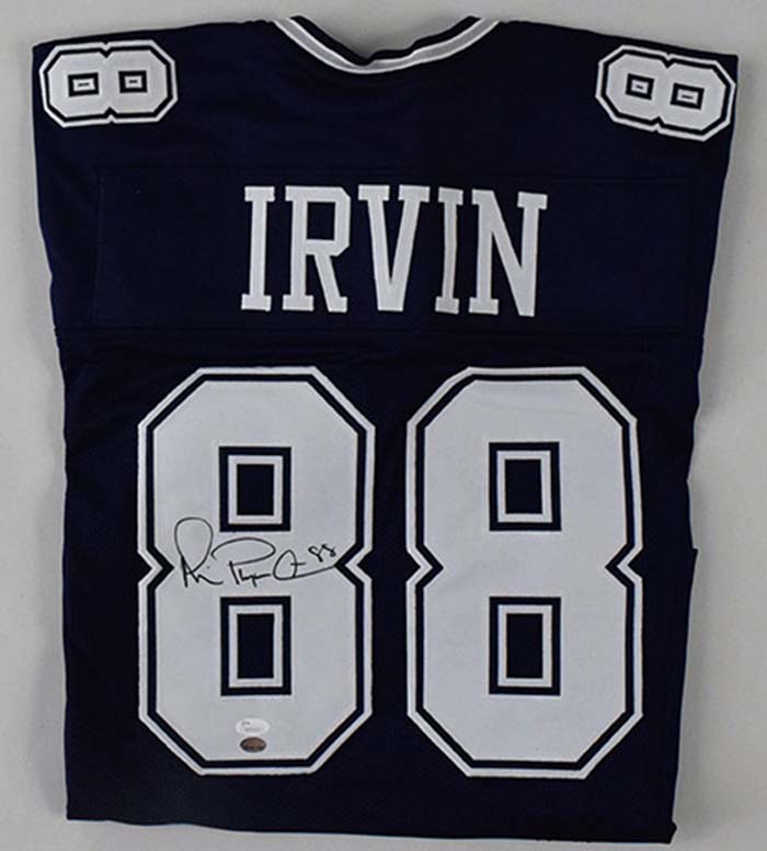 Description:Michael Irvin signed Dallas Cowboys style jersey, JSA & Irvin authenticated (NM). Size XL #88 Michael Irvin jersey signed by Irvin in black marker with "Playmaker" nickname added. Signature rates 8/9 out of 10. Comes with COA from JSA (GTSM Michael Irvin and JSA stickers are affixed). No maker tagging is present: NM