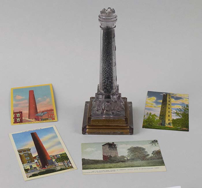Description:Rare "Collier Shot Tower Company" glass advertising display (EX) Uniquely fashioned vintage display piece is done in glass in the form of a shot tower and has "Collier Shot Tower Company St. Louis Mo" lettered on opposite sides. Base is inpainted with some gold color (touches have flaked off) and it is filled with graduated size shot. A paper insert on bottom is a reproduction replacement. Rare period advertising or salesman's sample offering strong display qualities. Also includes (4) vintage postcards, each showing view of a shot tower: EX ($500-$1,000)