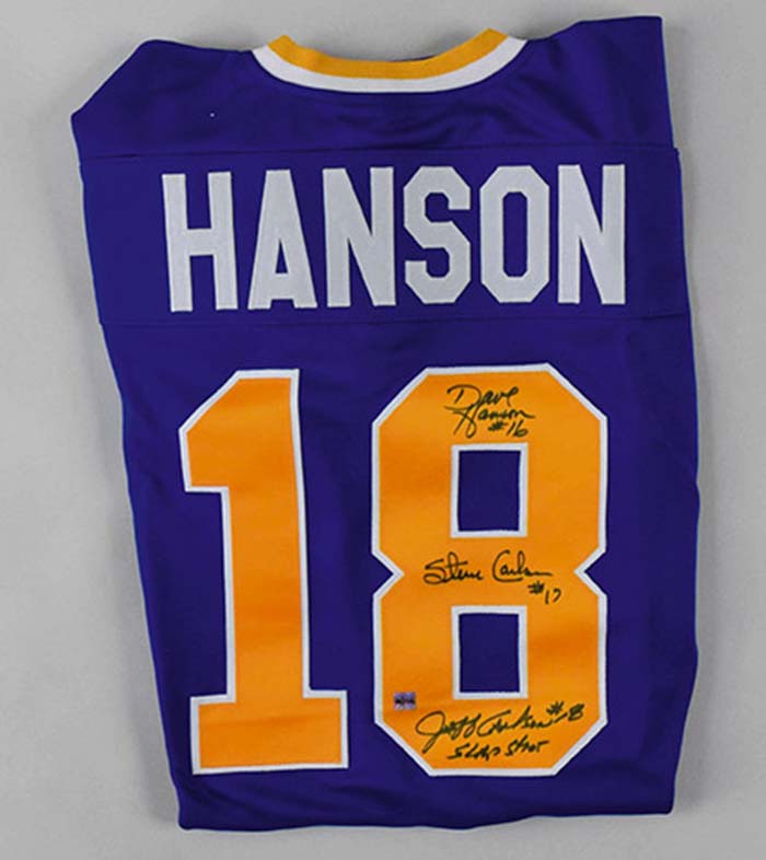 Description:Dave Hanson, Jeff Carlson, Steve Carlson (Slap Shot movie) multi-signed Charlestown Chiefs jersey (NM). Size XL Chiefs #18 jersey signed by Dave Hanson (former NHL player and played Jack Hanson in the movie), Jeff Carlson with "Slap Shot" inscription (played Jeff Hanson), and Steve Carlson (played Steve Hanson). Signatures rate 8/9 to 9/10 out of 10. Comes with Sports Integrity COA (hologram sticker is affixed). No maker tagging is present: NM