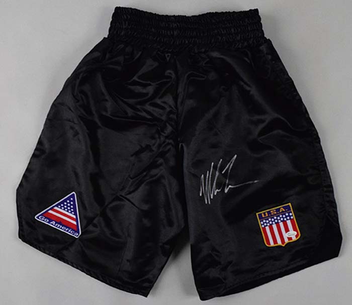 Description:Mike Tyson signed USA boxing trunks, JSA (NM/MT). Size XL trunks signed by Tyson in silver marker. Signature rates 9 out of 10. Comes with COA from JSA (serial #ed sticker is affixed): NM/MT