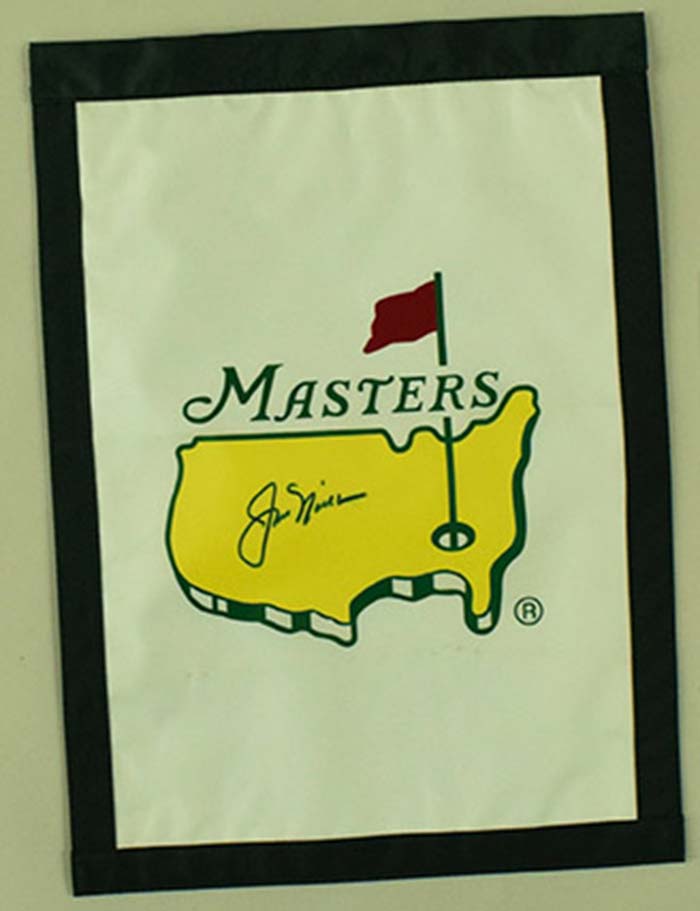 Jack Nicklaus signed Masters flag (NM). 13"x18" flag signed by Nicklaus in blue marker. Signature rates 9 out of 10: NM