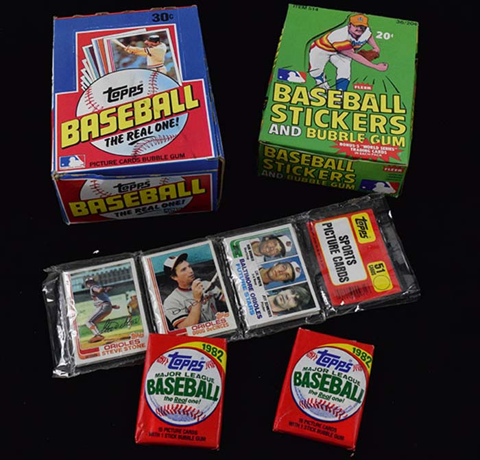 Description:Lot of baseball card rack & wax packs from 1980-1982 including 1982 Topps wax box (NM-MT). Incl. 1980 Fleer Baseball Stickers wax box (36) packs, 1982 Topps rack pack (51 cards including Cal Ripken rookie on top), 1982 Topps wax box (36 packs, box is torn at one joint but packs appear untouched), and (2) extra 1982 Topps wax packs (one has small tear at top edge). It is presumed that the cards inside remain in high grade condition: NM-MT