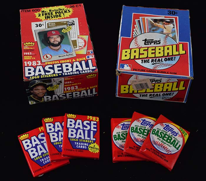 Description:1982 Topps and 1983 Fleer Baseball wax boxes (NM-MT). Incl. 1982 Topps wax box containing (36) packs, and 1983 Fleer wax box containing (36) packs. It is presumed that the cards inside remain in high grade condition: NM-MT