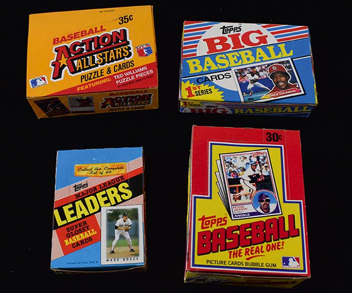Lot of assorted baseball wax boxes, etc. from 1983-1991 including 1983 Topps wax box (NM-MT). Incl. 1983 Donruss "Action All Stars" box (36 packs), 1983 Topps wax box (36 packs), 1984 Donruss "Action All Stars" box (36 packs), 1984 Donruss "Baseball Champions" box (36 packs), 1985 Donruss "Action All Stars" box (36 packs), 1985 Topps Rub-Downs box (36 packs), (2) 1986 Topps "Major League Leaders" boxes (36 packs per box), (3) 1988 Topps "Big" series 1 boxes (36 packs per box), (3) 1988 Topps "Big" series 2 boxes (36 packs per box), 1991 Topps "Superstar Stand-Ups" box (36 dispensers), and 1991 Upper Deck box (36 packs). It is presumed that the contents remain in high grade condition: NM-MT