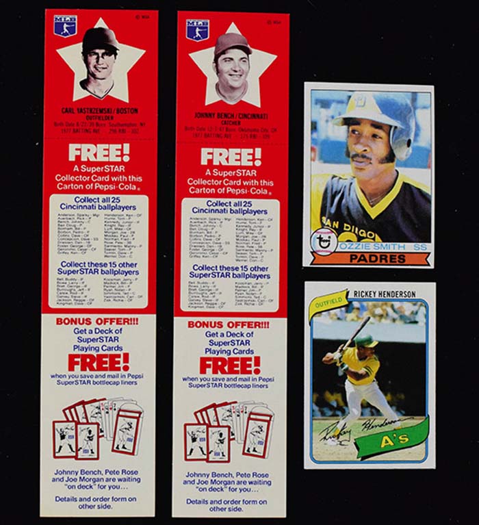 Description:1978 Pepsi, 1979 Topps, and 1980 Topps Baseball card sets (VG/EX-NM/MT). Incl. 1978 Pepsi Superstars set with all cards uncut and still attached to the checklist portions (NM overall); 1979 Topps set with #116 Ozzie Smith rookie (EX/MT-NM oc), remainder appear to average EX/MT-NM overall; and 1980 Topps set with #482 Rickey Henderson rookie (EX/MT), remainder appear to average NM overall. Range: VG/EX-NM/MT