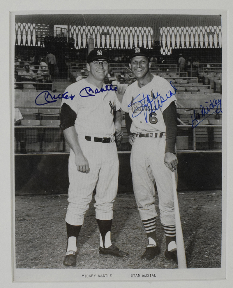 Description:Mickey Mantle and Stan Musial signed 8"x10" photo (EX/MT-NM) Black and white photo has been signed in marker rating 7 (slight imperfection to Mantle) to 9/10 out of 10. Musial is personalized. Framed to 12.5"x14.5": EX/MT-NM