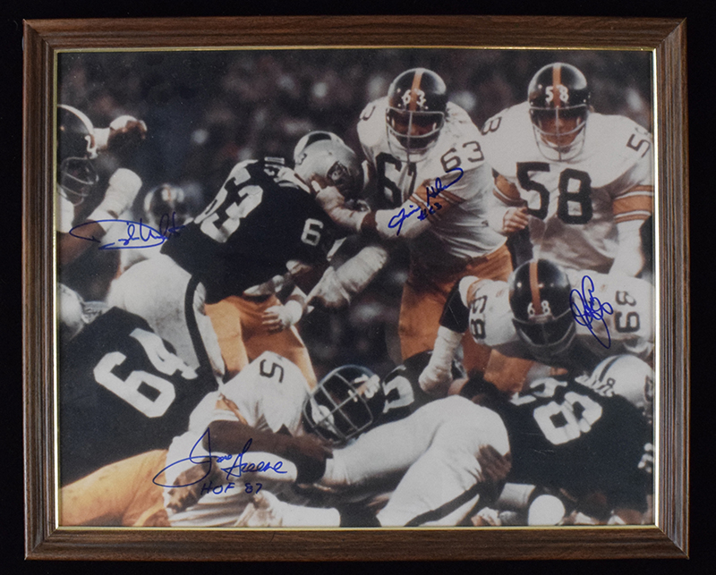 Description:Steel Curtain - Greene, Holmes, White, and Greenwood signed 16"x20" photo (NM) Color photo has been signed in marker by all (4) rating 9/10 out of 10. Framed to slightly larger dimensions for display: NM