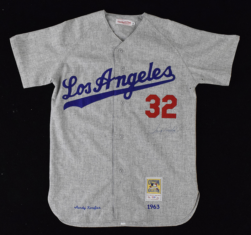 Description:Sandy Koufax signed Los Angeles Dodgers Mitchell & Ness throwback jersey (PSA/DNA) (EX/MT-NM) Gray flannel jersey done in 1963 style has been signed in marker rating 7/8 out of 10. PSA/DNA authentication sticker affixed (P00160) however the letter itself is not included: EX/MT-NM ($500-$750)