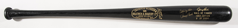 Description:Johnny Bench autographed limited edition baseball bat from the Bench Collection (number "5" of the edition) (NM) Louisville Slugger bat has Bench facsimile signature in the barrel along with "Hall of Famer, 1989 Edition, 5 of 2000" text. Signed "Catch Ya Later Johnny Bench" in gold marker rating 9 out of 10. Includes auction LOA from JSA and letter of provenance from Johnny Bench: NM ($300-$500)