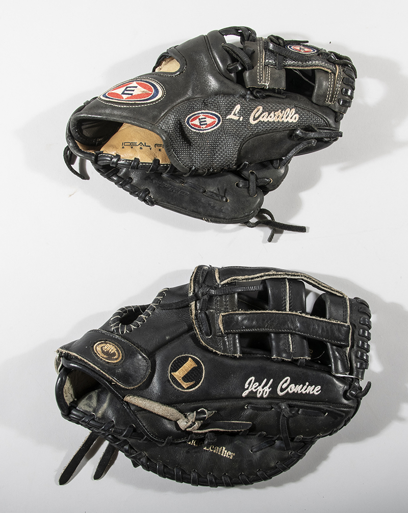 Description:Luis Castillo and Jeff Conine Florida Marlins professional model baseball gloves from the Ivan Rodriguez Collection (EX) Includes Luis Castillo Easton black leather glove showing heavy use and a Jeff Conine Louisville Slugger black leather first baseman's mitt showing heavy use. Includes LOA from Hunt Auctions and letter of provenance from Ivan Rodriguez: EX ($300-$500)