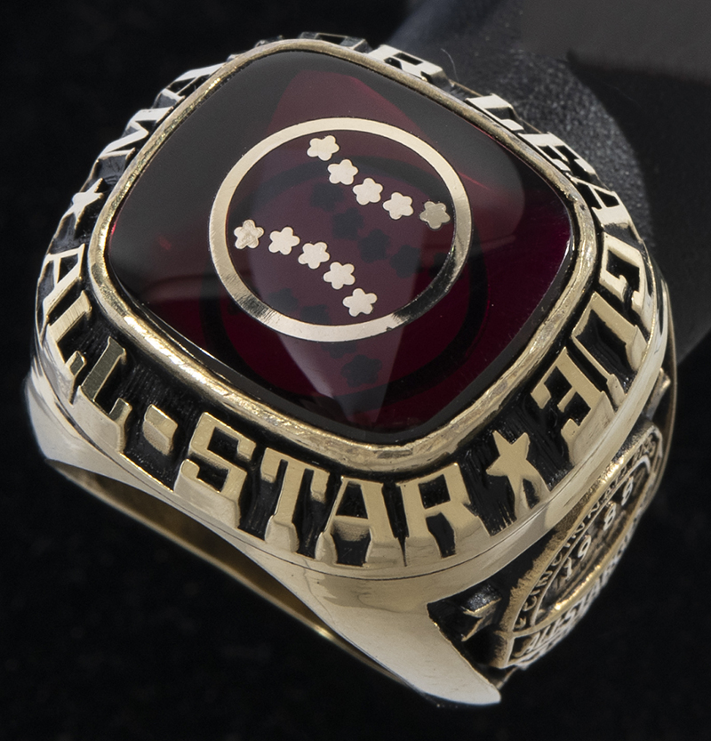 Description:1988 All-Star game ladies ring from the Chub Feeney Collection (NM) Original presentational ring issued for the game played in Cincinnati. Maroon stone face is accented with baseball decoration and lettered "Major League All-Star" around the edge. National League logo appears on one shank and the game logo is on the opposite. Marked "Jostens QGT" on the interior band which is engraved "Kary Feeney." Size (6.5) with little to no mentionable wear. Includes letter of provenance from the Feeney Family: NM ($500-$750)